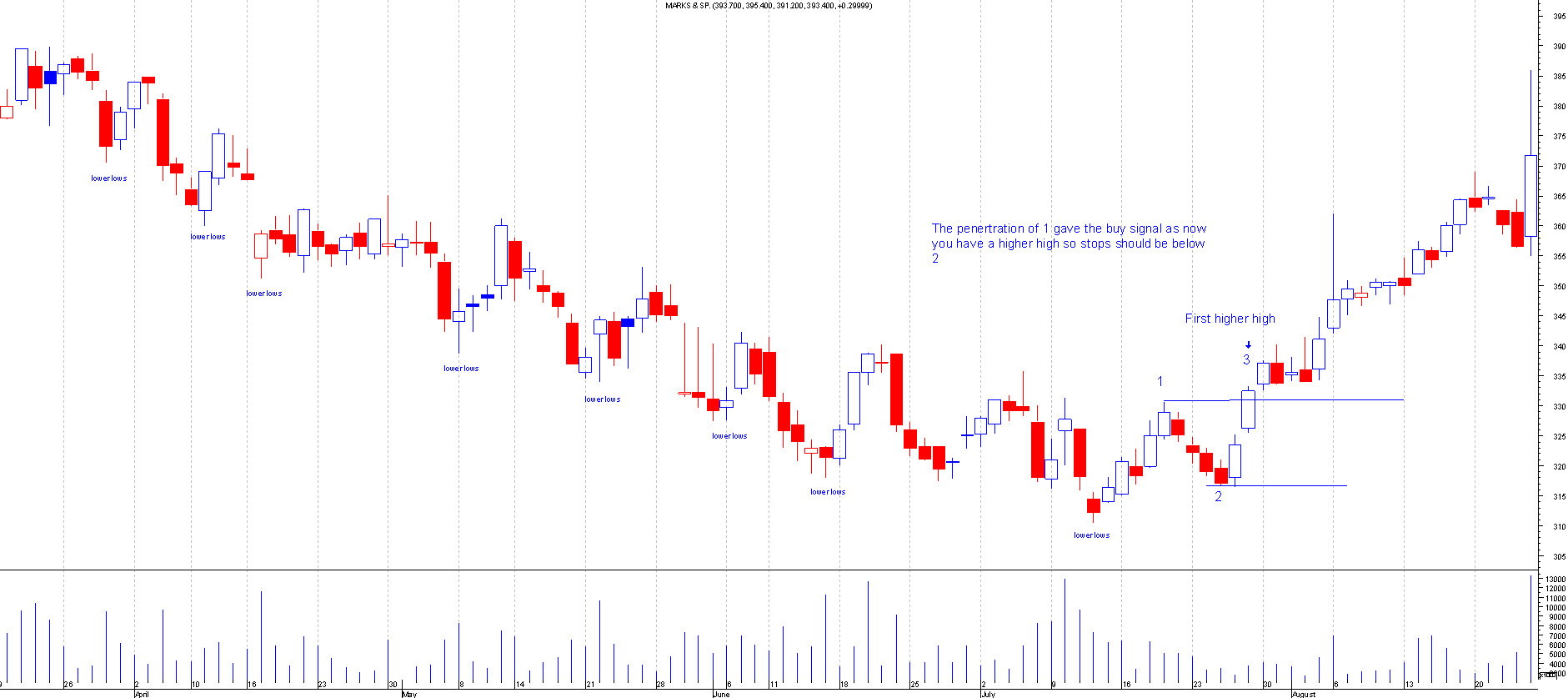 If it does not go below the low but starts to move higher from here then you can label it 2. Now the buy signal comes once the price goes above the high of label 1, by doing so you have also got yourself a higher high.