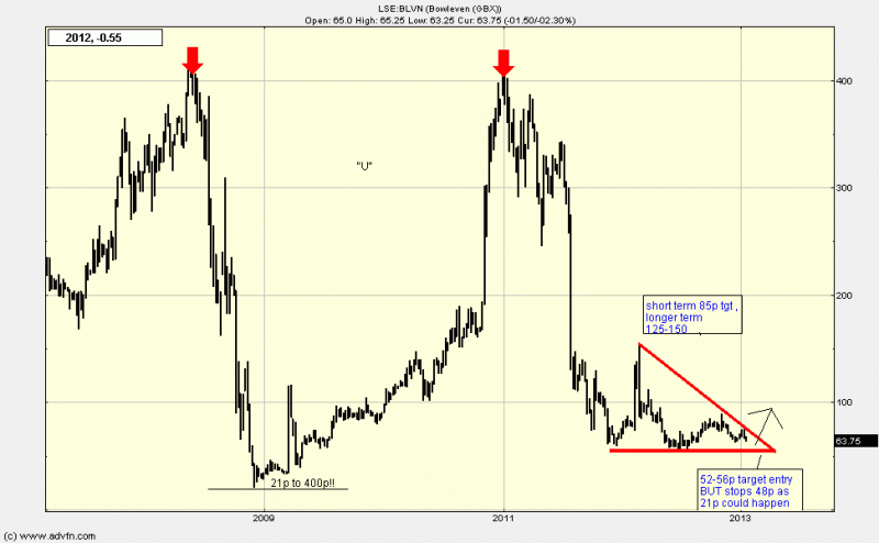 at some stage this will give a HUGE return..but for now it looks like the predicted 66 and then 62-64p areas are being hampered by the seller...next entry target 52-56p...NORMALLY 50p is solid support on a downmove so stops just below...I still reckon 85p and possibly 125p+ achieveable this year...as we approach the 55p area watch the bid rumours resurface?...GOOD VALUE opportunity me thinks, but wait till signs that seller is/or neraly done (guesswork for me!)