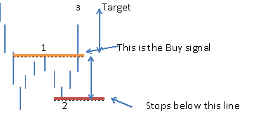 Stops should be placed below label 2, the target could be the distance from top of 1 to the bottom of 2, which then can be projected from the breakout point.