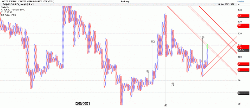 The daily closing prices p&f chart has a (met) target of 105.25 but only when we use a 0.25 x 3 box size.